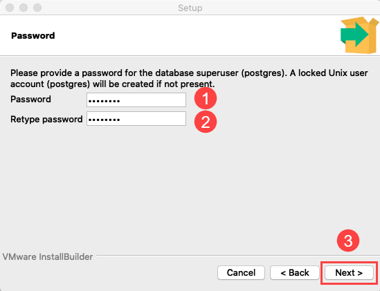 Fifth, enter the password for the postgres user account. You should note down this password for logging in to the PostgreSQL database server later. After that, click the Next button.