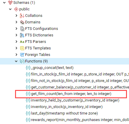 • Second, the get_film_count() function accepts two parameters len_from and len_to with the integer type.